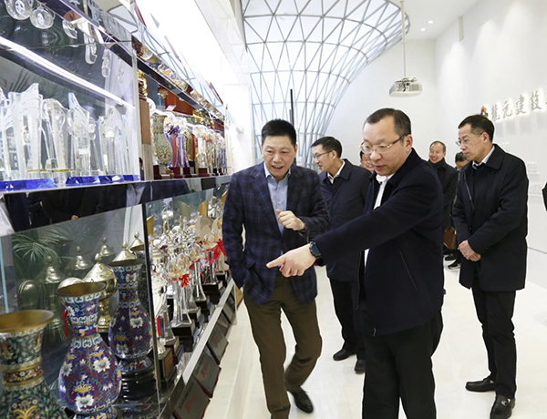 △沈敏一行在賴朝暉陪同下參觀龍元展廳