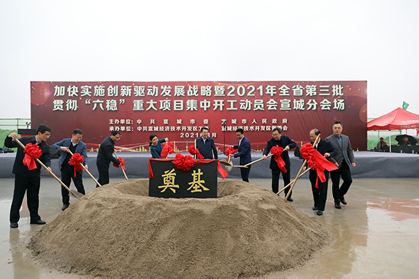 隨著參加活動的領導、嘉賓一同揮動鐵鍬,鏟起象征希望的第一鏟土,為宣城市第三批重點項目集中開工培土奠基,標志著龍元明筑裝配式建筑科技產業園項目正式開工!