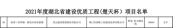 近日,龍?jiān)ㄔO(shè)湖北分公司承建的荊門·星球世界城一期項(xiàng)目獲得2020-2021年度湖北省建筑行業(yè)工程質(zhì)量的最高榮譽(yù)獎(jiǎng)——楚天杯。