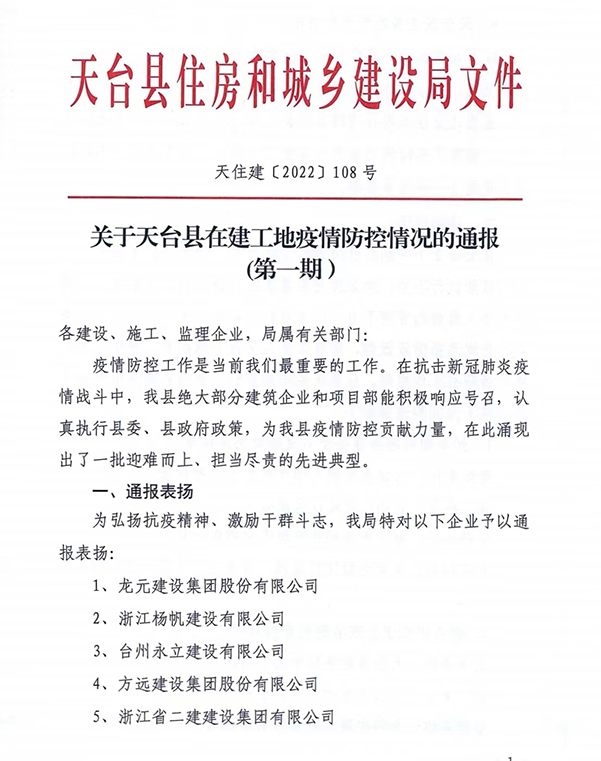 5月1日勞動節,項目部收到了來自天臺縣住建局的通報表揚:“表揚龍元建設能在戰“疫”危急時刻,主動馳援,充分發揮企業優勢,積極履行縣里政策要求,對縣內封控區周邊全區域進行硬隔離防護工作,用自己的方式支援疫情防控,譜寫了新時代企業的社會責任與擔當,為天臺縣抗擊疫情防控筑起了一道堅實屏障。”