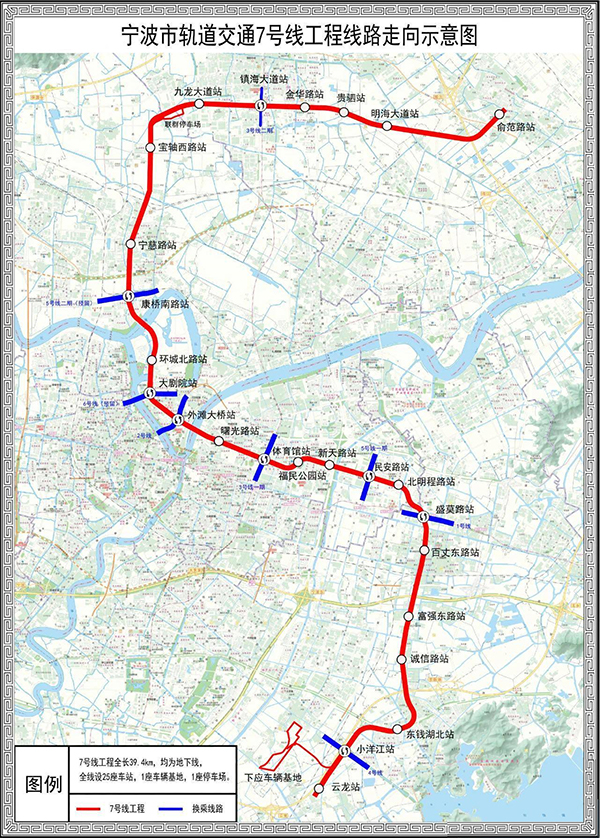 寧波軌道交通7號線,是寧波市城市軌道交通第三期建設規劃中的重要項目之一。7號線是寧波軌道交通主干線的輔助線,分擔城市南北向發展的客流。項目一期南起鄞州區云龍站,經過下應街道、東部新城、三江口和鎮海新城等重點區域,北至鎮海區俞范東路站。線路全長39.4km,全部為地下站,全線設25座車站,線路分別在北端聯群設停車場1座和鄞州下應設車輛基地1座,平均站間距1.6km。