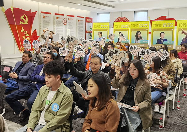 為了讓更多龍元青年能夠參與到活動當(dāng)中,本次「開放麥」決賽除了由5位專業(yè)評審打分外,還面向全集團開放線上、線下共30個大眾評審席位,通過投票來對各位選手進行打分。報名通道開啟后,龍元青年們熱情高漲,30個名額很快一搶而空。決賽當(dāng)天,18名現(xiàn)場大眾評審和12名線上大眾評審認真聆聽每一位選手的演說,親手選出了受到青年人認可的“TALK KING”。