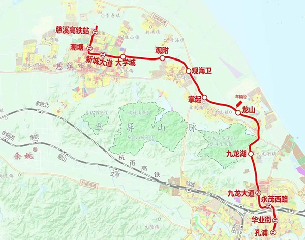 寧波至慈溪市域(郊)鐵路(簡稱“寧慈線”),作為寧波市軌道交通10號線,為寧波市軌道交通網中的北翼骨架線,承擔寧波中心城區至北部副城的中長距離出行及沿線城鎮間內部通勤出行。線路起于江北區孔浦站,終于慈溪高鐵站,經新寧波北、鎮海、龍山、掌起、觀海衛、附海、坎墩,分別與地鐵2號線、5號線、3號線、7號線換乘。線路全長約64公里,地下線長約17.5公里,設站十二座,平均站間距約6.0公里,其中地下站5座且均為換乘站,在慈溪高鐵站北端設車輛段一座,在龍山設停車場一座。